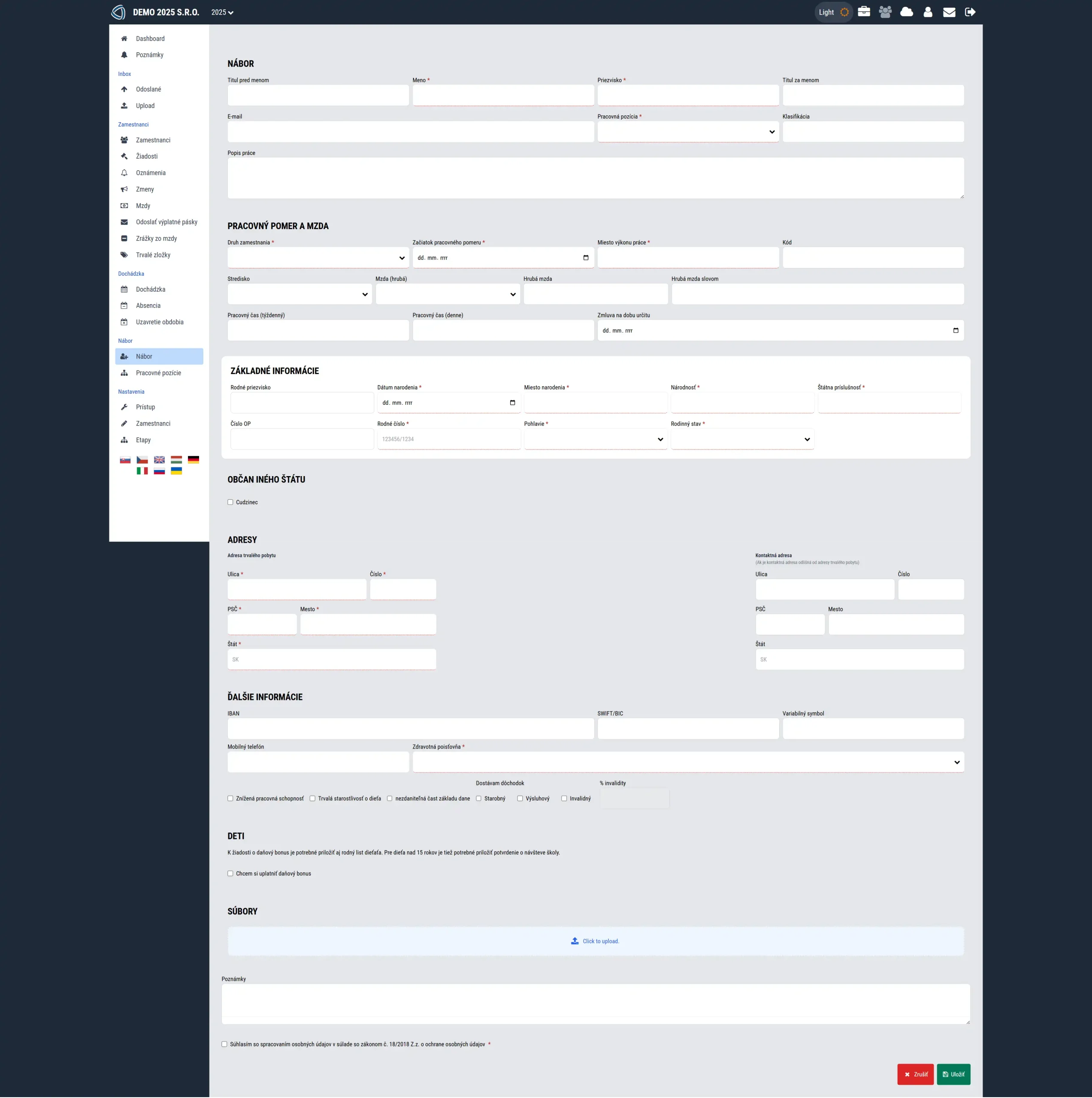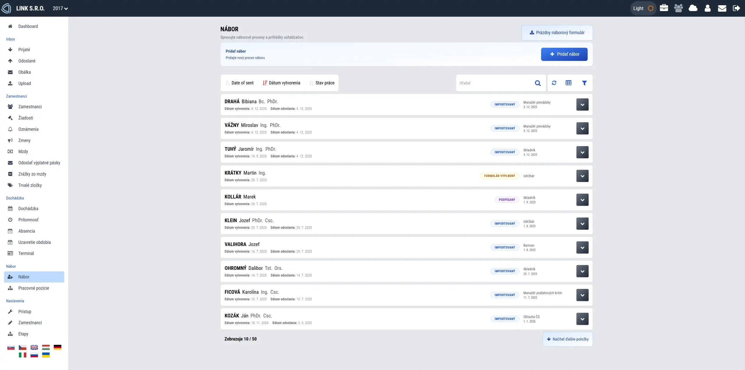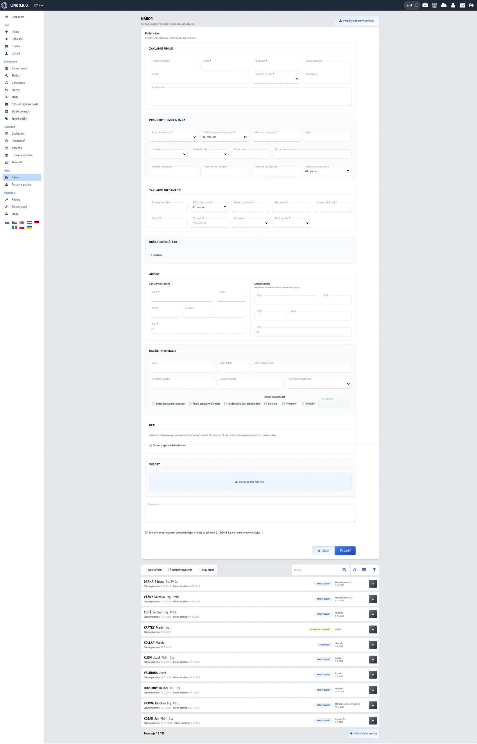 Používateľ vždy jasne vidí, kde vytvoriť nový záznam (nová žiadosť, nový pracovník, nový nábor, atď.).